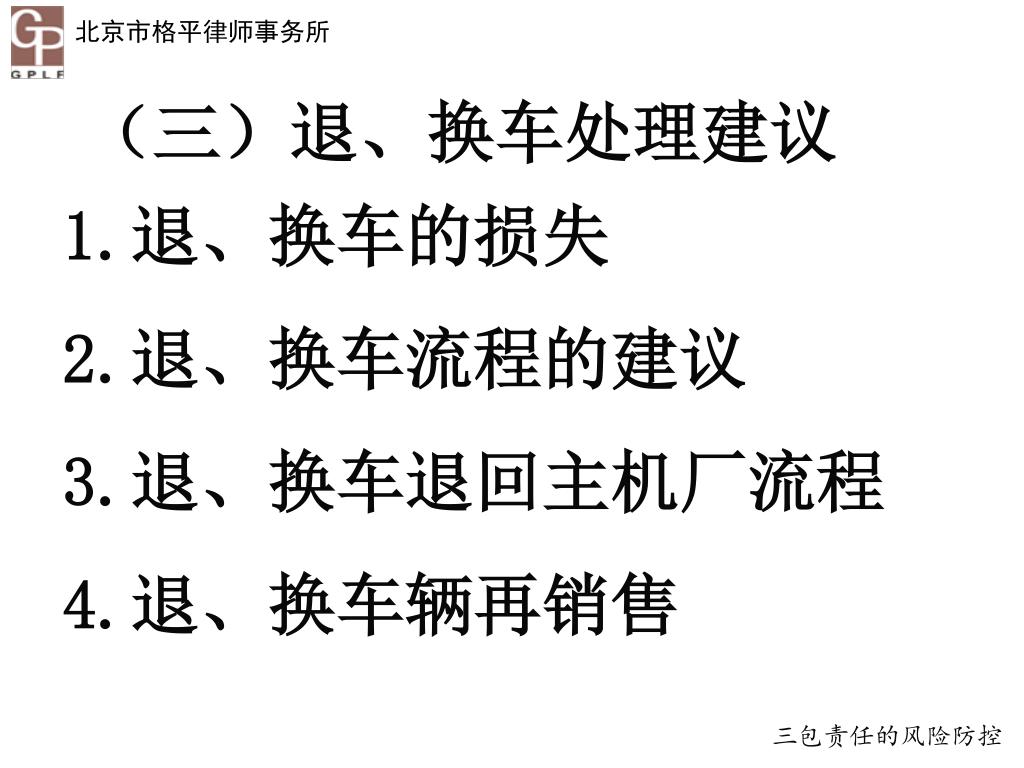 (三)退、换车处理建议 1.退、换车的损失 2.退、换车流程的建议 3.退、换车退回主机厂流程 4.退、换车辆再销售 三包责任的风险防控