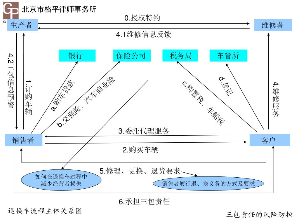 0.授权特约 生产者 维修者 4.1维修信息反馈 税务局 银行 保险公司 车管所 4.2三包信息预警 1.订购车辆 4.维修服务 a.购车贷款 b.交强险、汽车商业险 d.登记 c.购置税、车船税 3.委托代理服务 销售者 客户 2.购买车辆 5.修理、更换、退货要求 如何在退换车过程中 减少经营者损失 销售者履行退、换义务的方式及要求 6.承担三包责任 退换车流程主体关系图 三包责任的风险防控