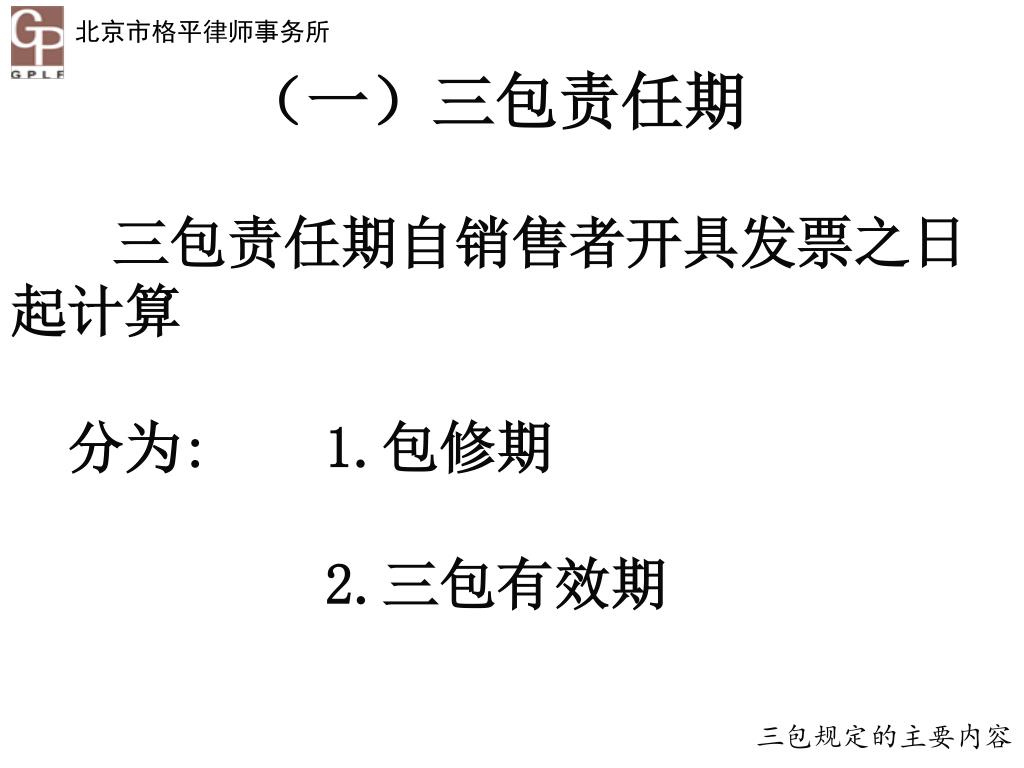 (一)三包责任期 三包责任期自销售者开具发票之日起计算 分为:1.包修期 2.三包有效期 三包规定的主要内容