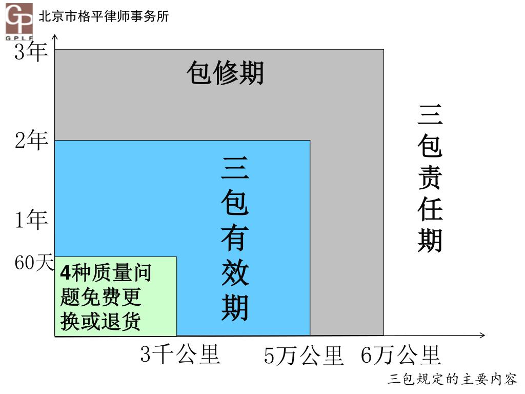3年 包修期 三包责任期 2年 三 包 有 效 期 1年 60天 4种质量问题免费更 换或退货 3千公里 6万公里 5万公里 三包规定的主要内容