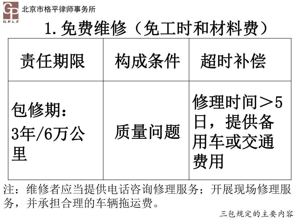 1.免费维修(免工时和材料费) 注:维修者应当提供电话咨询修理服务;开展现场修理服务,并承担合理的车辆拖运费。 三包规定的主要内容