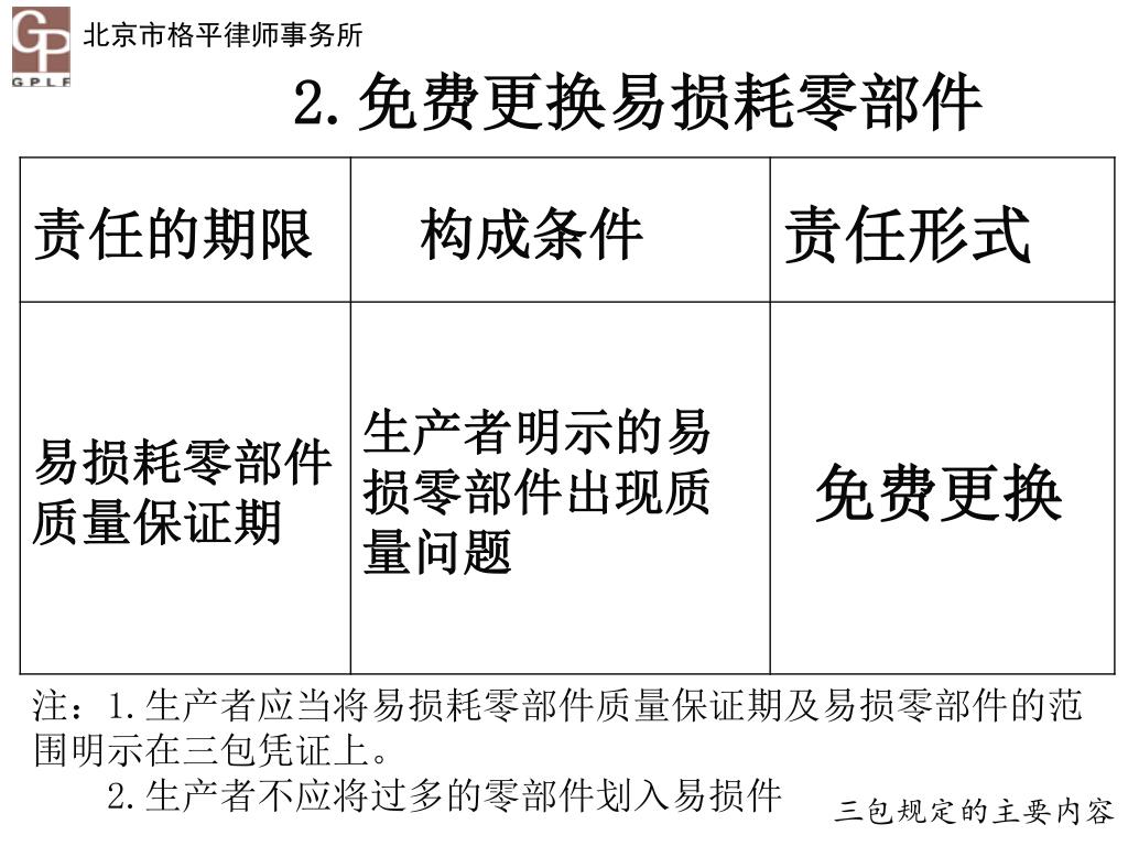 2.免费更换易损耗零部件 注:1.生产者应当将易损耗零部件质量保证期及易损零部件的范围明示在三包凭证上。 2.生产者不应将过多的零部件划入易损件 三包规定的主要内容