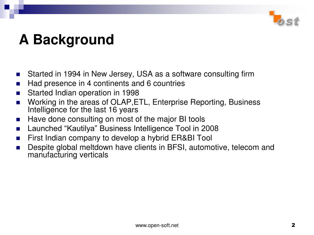 A Background • Started in 1994 in New Jersey, USA as a software consulting firm • Had presence in 4 continents and 6 countries • Started Indian operation in 1998 • Working in the areas of OLAP,ETL, Enterprise Reporting, Business Intelligence for the last 16 years • Have done consulting on most of the major BI tools • Launched “Kautilya” Business Intelligence Tool in 2008 • First Indian company to develop a hybrid ER&BI Tool • Despite global meltdown have clients in BFSI, automotive, telecom and manufacturing verticals www.open-soft.net