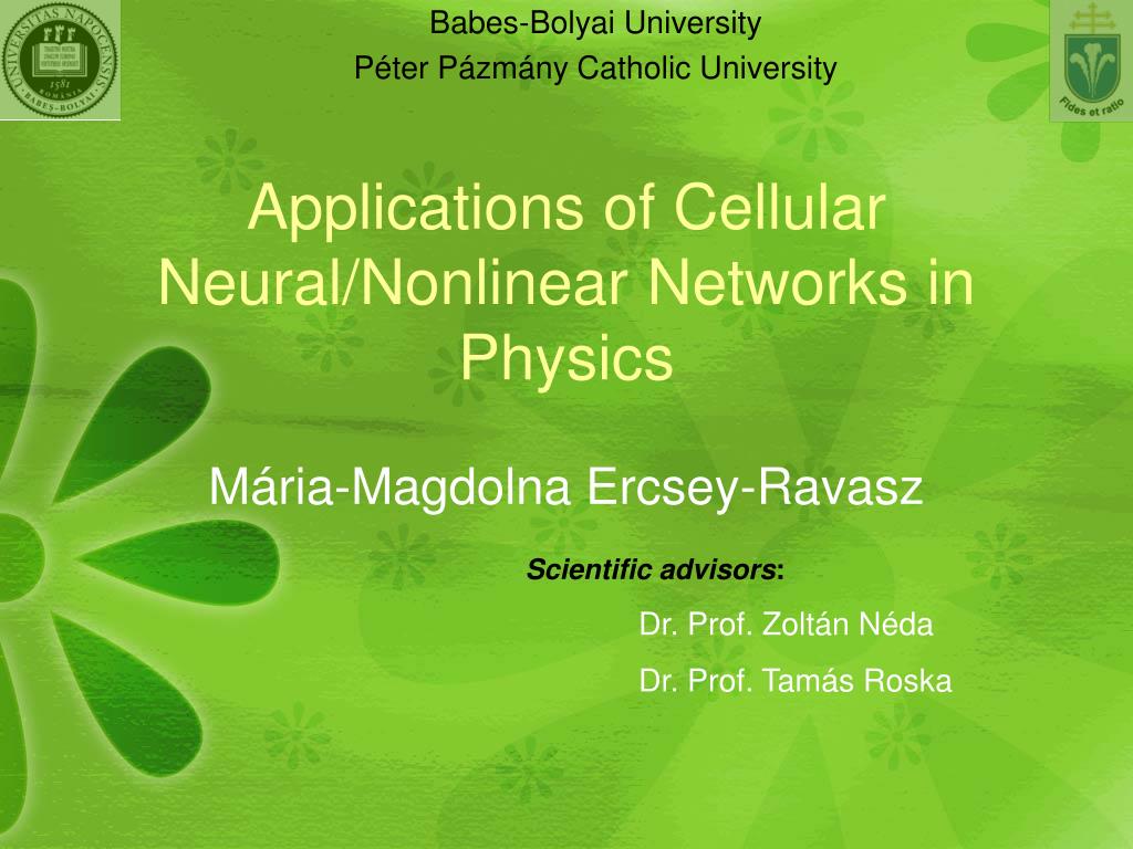 Babes-Bolyai University Péter Pázmány Catholic University. Applications of Cellular Neural/Nonlinear Networks in Physics. M ária-Magdolna Ercsey-Ravasz. Scientific advisors : Dr. Prof. Zolt á n N é da Dr. Prof. Tam á s Roska. Outline. CNN computing A realistic random number generator