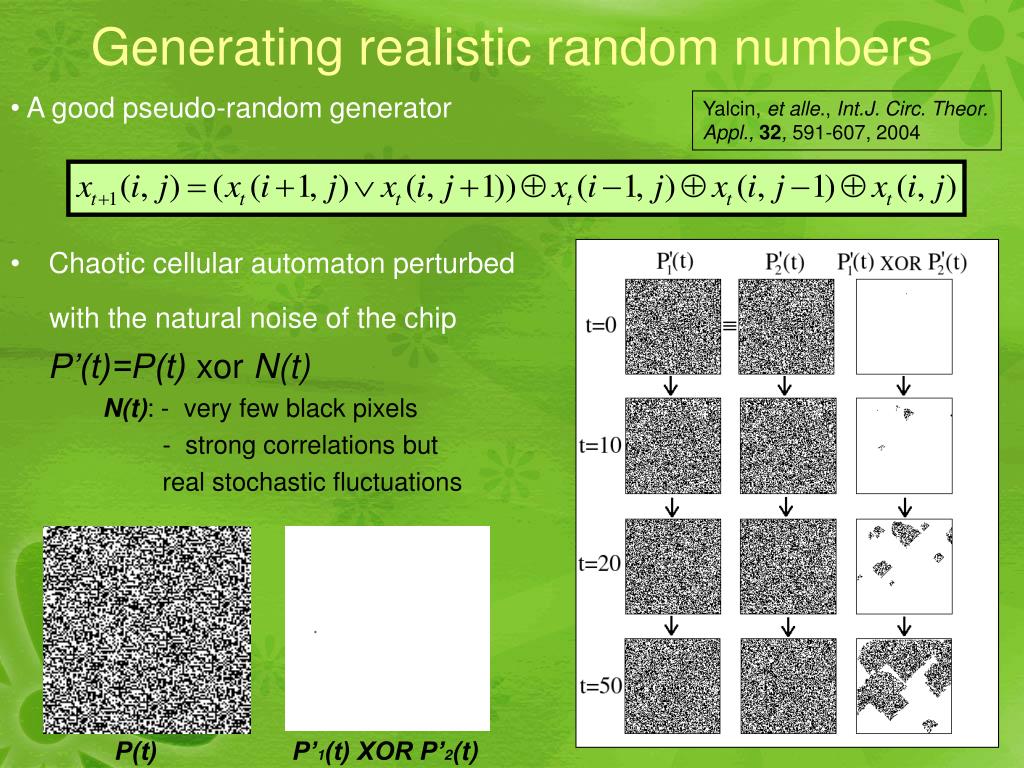 Generating realistic random numbers • A good pseudo-random generator Yalcin, et alle., Int.J. Circ. Theor. Appl., 32, 591-607, 2004 • Chaotic cellular automaton perturbed with the natural noise of the chip P’(t)=P(t) xor N(t) N(t): - very few black pixels - strong correlations but real stochastic fluctuations P(t) P’1(t) XOR P’2(t)