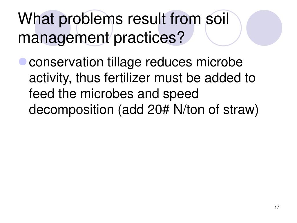 What problems result from soil management practices? • conservation tillage reduces microbe activity, thus fertilizer must be added to feed the microbes and speed decomposition (add 20# N/ton of straw)