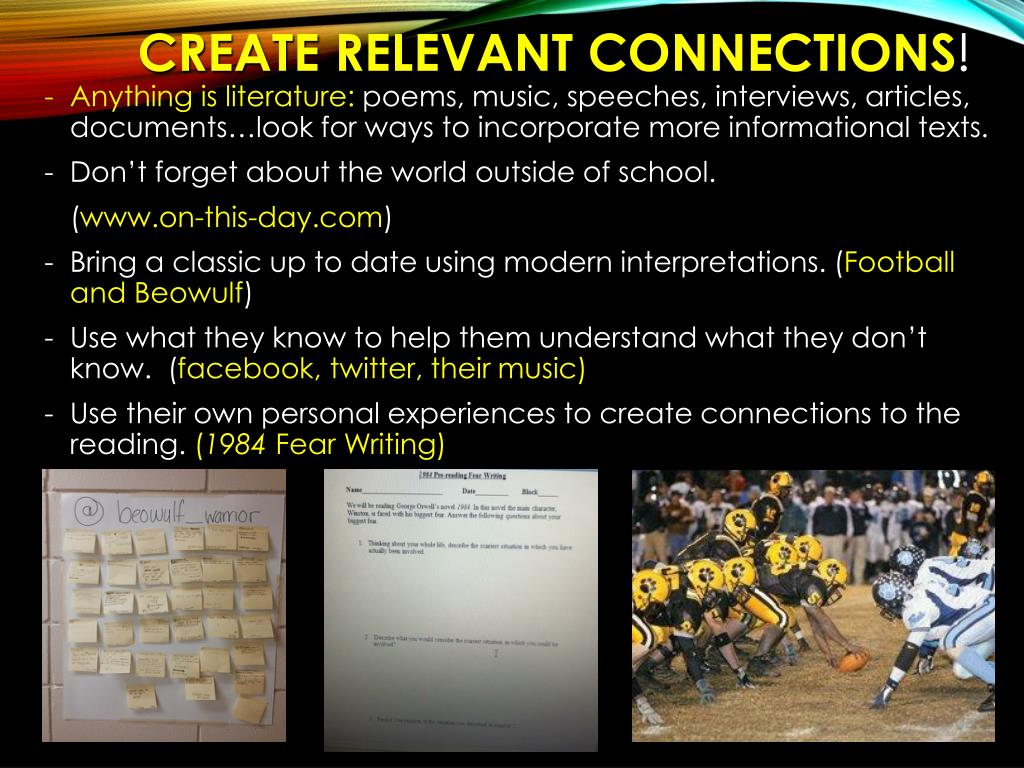 Create relevant connections! Anything is literature: poems, music, speeches, interviews, articles, documents…look for ways to incorporate more informational texts. Don’t forget about the world outside of school. (www.on-this-day.com) Bring a classic up to date using modern interpretations. (Football and Beowulf) Use what they know to help them understand what they don’t know. (facebook, twitter, their music) Use their own personal experiences to create connections to the reading. (1984 Fear Writing)
