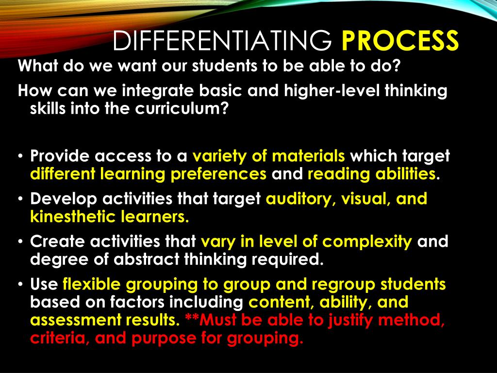 Differentiating process What do we want our students to be able to do? How can we integrate basic and higher-level thinking skills into the curriculum? • Provide access to a variety of materials which target different learning preferences and reading abilities. • Develop activities that target auditory, visual, and kinesthetic learners. • Create activities that vary in level of complexity and degree of abstract thinking required. • Use flexible grouping to group and regroup students based on factors including content, ability, and assessment results. **Must be able to justify method, criteria, and purpose for grouping.