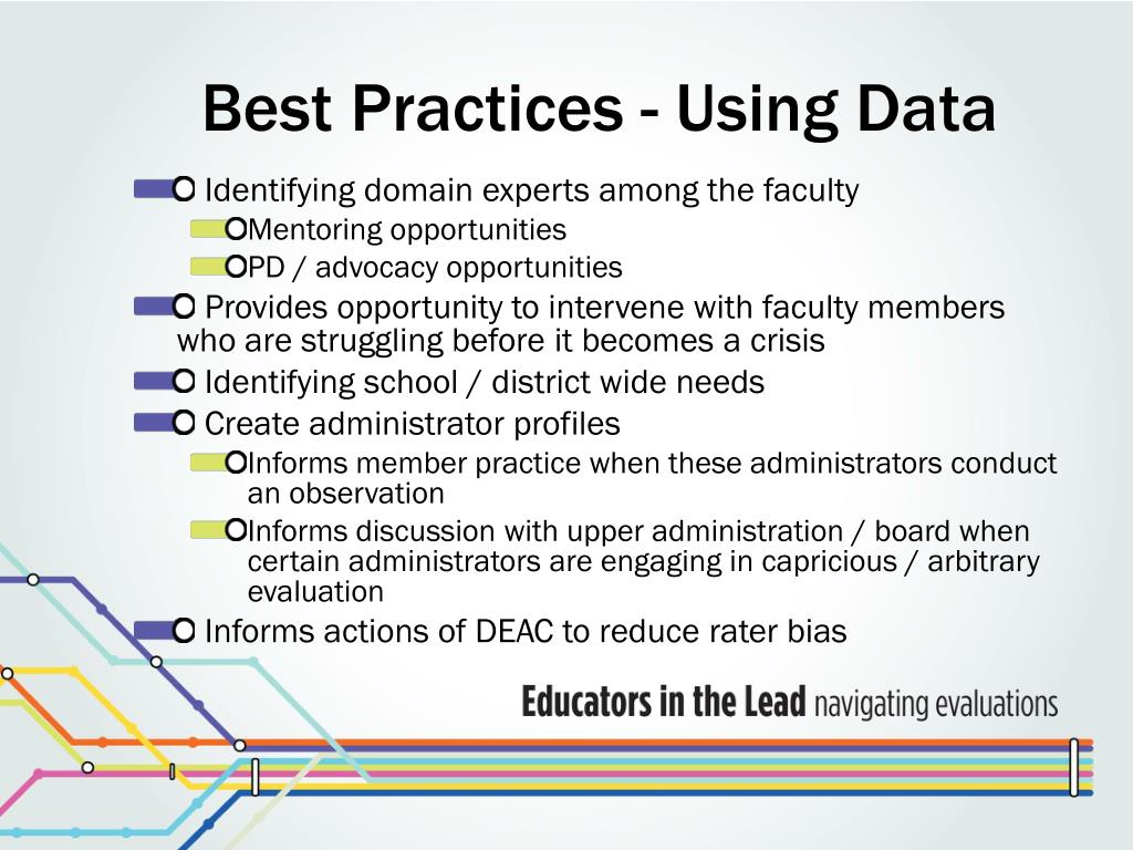 Best Practices - Using Data • Identifying domain experts among the faculty • Mentoring opportunities • PD / advocacy opportunities • Provides opportunity to intervene with faculty members who are struggling before it becomes a crisis • Identifying school / district wide needs • Create administrator profiles • Informs member practice when these administrators conduct an observation • Informs discussion with upper administration / board when certain administrators are engaging in capricious / arbitrary evaluation • Informs actions of DEAC to reduce rater bias