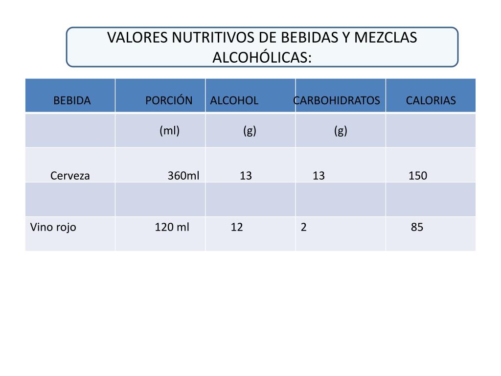 VALORES NUTRITIVOS DE BEBIDAS Y MEZCLAS ALCOHÓLICAS: BEBIDA PORCIÓN ALCOHOL CARBOHIDRATOS CALORIAS (ml) (g) (g) Cerveza 360ml 13 13 150