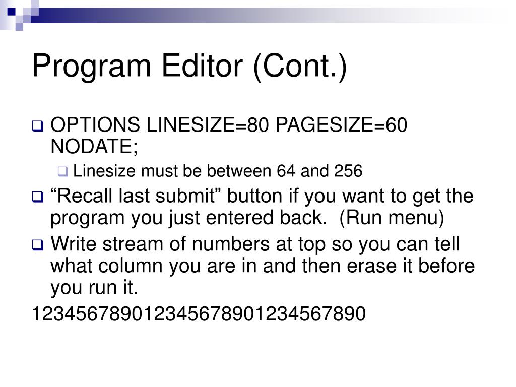 Program Editor (Cont.) • OPTIONS LINESIZE=80 PAGESIZE=60 NODATE; • Linesize must be between 64 and 256 • “Recall last submit” button if you want to get the program you just entered back. (Run menu) • Write stream of numbers at top so you can tell what column you are in and then erase it before you run it. 123456789012345678901234567890