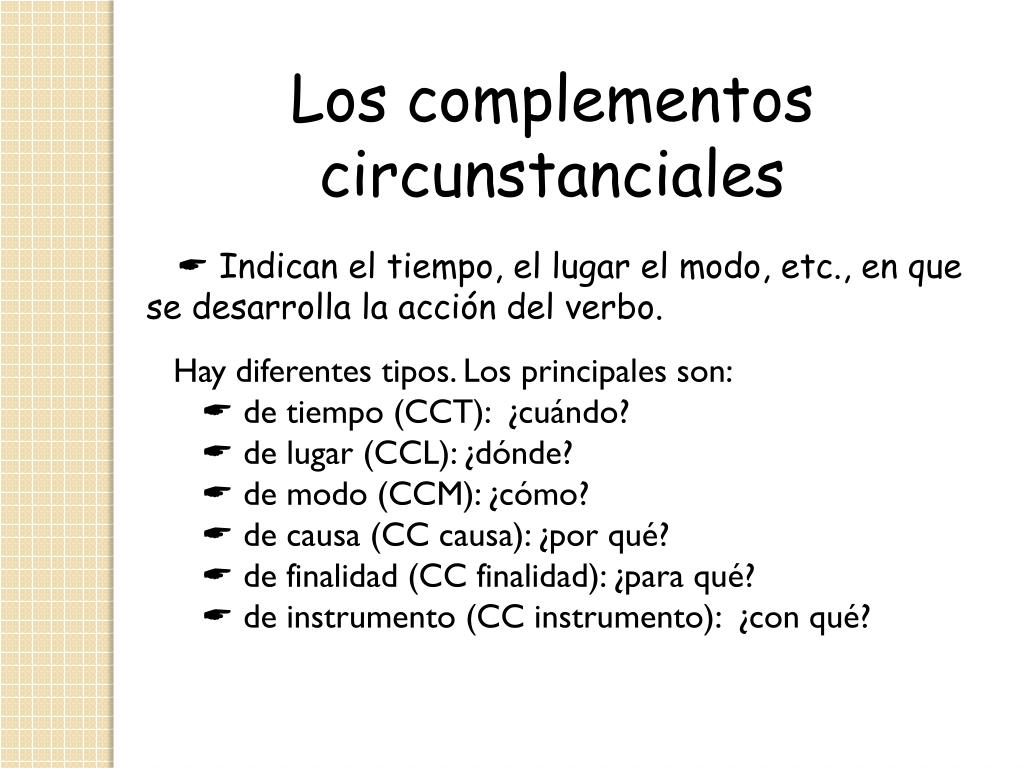Los complementos circunstanciales Indican el tiempo, el lugar el modo, etc., en que se desarrolla la acción del verbo. Hay diferentes tipos. Los principales son: de tiempo (CCT): ¿cuándo? de lugar (CCL): ¿dónde? de modo (CCM): ¿cómo? de causa (CC causa): ¿por qué? de finalidad (CC finalidad): ¿para qué? de instrumento (CC instrumento): ¿con qué?