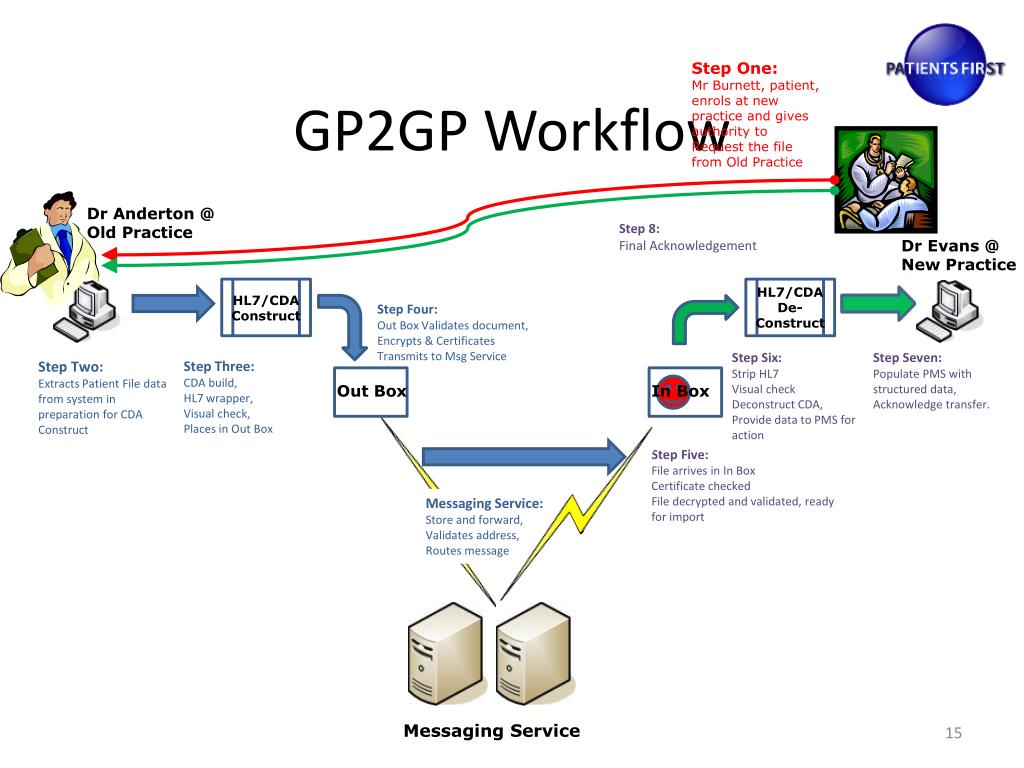 GP2GP Workflow Step One: Mr Burnett, patient, enrols at new practice and gives authority to Request the file from Old Practice Dr Anderton @ Old Practice Step 8: Final Acknowledgement Dr Evans @ New Practice HL7/CDA De-Construct HL7/CDA Construct Step Four: Out Box Validates document, Encrypts & Certificates Transmits to Msg Service Step Six: Strip HL7 Visual check Deconstruct CDA, Provide data to PMS for action Step Seven: Populate PMS with structured data, Acknowledge transfer. Step Two: Extracts Patient File data from system in preparation for CDA Construct Step Three: CDA build, HL7 wrapper, Visual check, Places in Out Box Out Box In Box Step Five: File arrives in In Box Certificate checked File decrypted and validated, ready for import Messaging Service: Store and forward, Validates address, Routes message Messaging Service