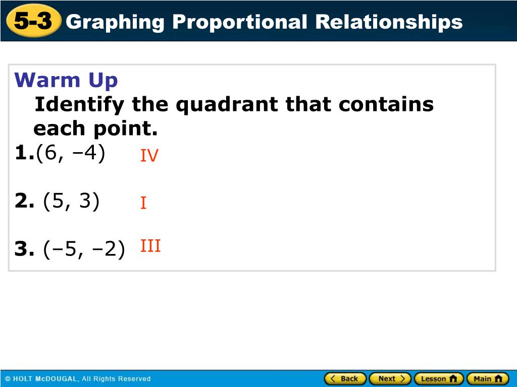 Warm Up. Problem of the Day. Lesson Presentation. Lesson Quizzes. Warm Up Identify the quadrant that contains each point. 1. (6, –4) 2. (5, 3) 3. (–5, –2). IV. I. III. Problem of the Day Graph the ordered pairs form the table. What letter do the points form?. V.
