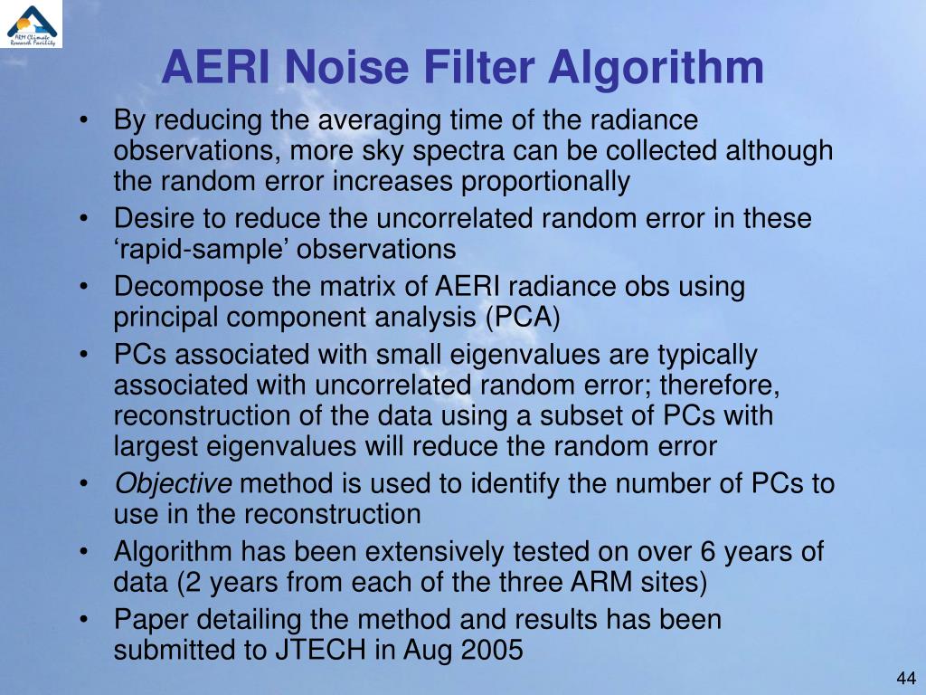 AERI Noise Filter Algorithm • By reducing the averaging time of the radiance observations, more sky spectra can be collected although the random error increases proportionally • Desire to reduce the uncorrelated random error in these ‘rapid-sample’ observations • Decompose the matrix of AERI radiance obs using principal component analysis (PCA) • PCs associated with small eigenvalues are typically associated with uncorrelated random error; therefore, reconstruction of the data using a subset of PCs with largest eigenvalues will reduce the random error • Objective method is used to identify the number of PCs to use in the reconstruction • Algorithm has been extensively tested on over 6 years of data (2 years from each of the three ARM sites) • Paper detailing the method and results has been submitted to JTECH in Aug 2005