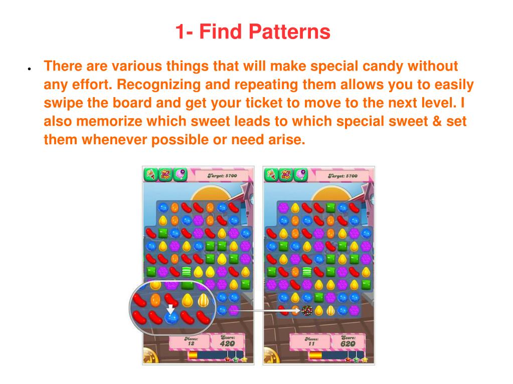 1- Find Patterns • There are various things that will make special candy without any effort. Recognizing and repeating them allows you to easily swipe the board and get your ticket to move to the next level. I also memorize which sweet leads to which special sweet & set them whenever possible or need arise.
