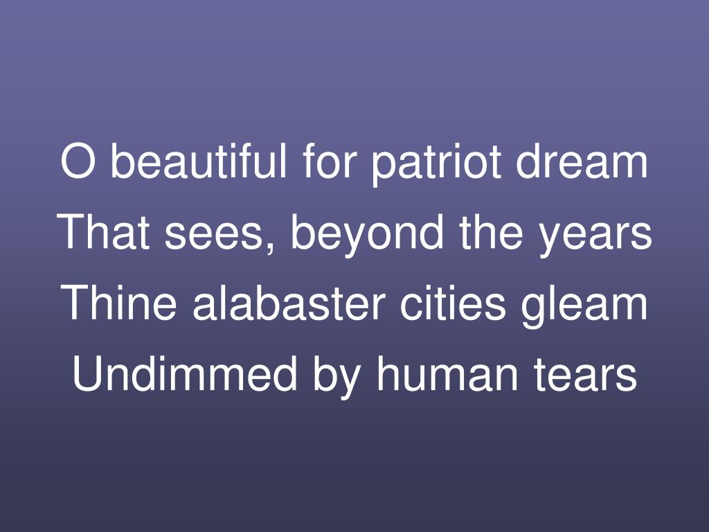 O beautiful for patriot dreamThat sees, beyond the yearsThine alabaster cities gleamUndimmed by human tears