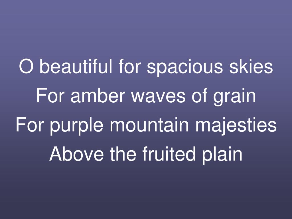 O beautiful for spacious skiesFor amber waves of grainFor purple mountain majestiesAbove the fruited plain