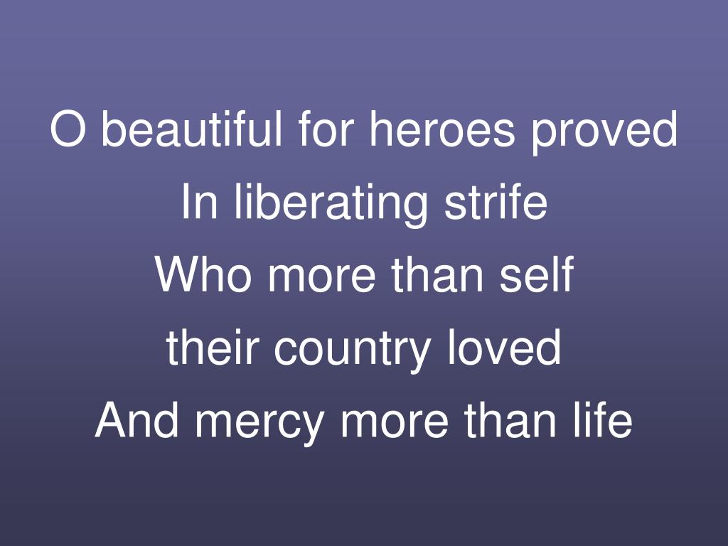 O beautiful for heroes provedIn liberating strifeWho more than selftheir country lovedAnd mercy more than life