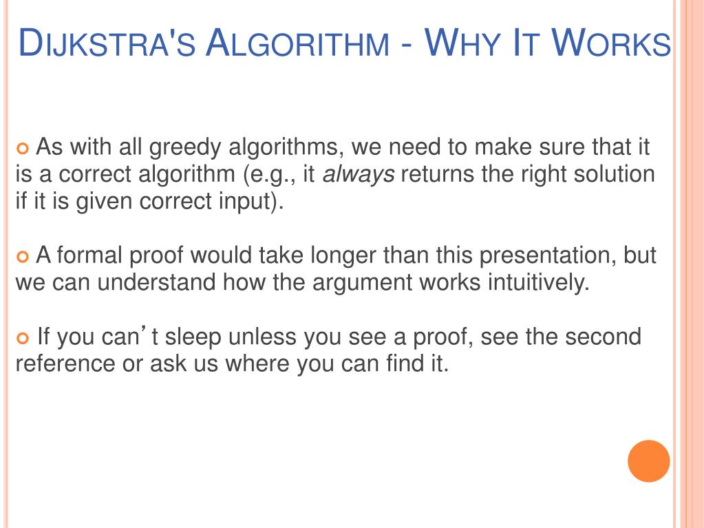 Dijkstra's Algorithm - Why It Works • As with all greedy algorithms, we need to make sure that it is a correct algorithm (e.g., it always returns the right solution if it is given correct input). • A formal proof would take longer than this presentation, but we can understand how the argument works intuitively. • If you can’t sleep unless you see a proof, see the second reference or ask us where you can find it.