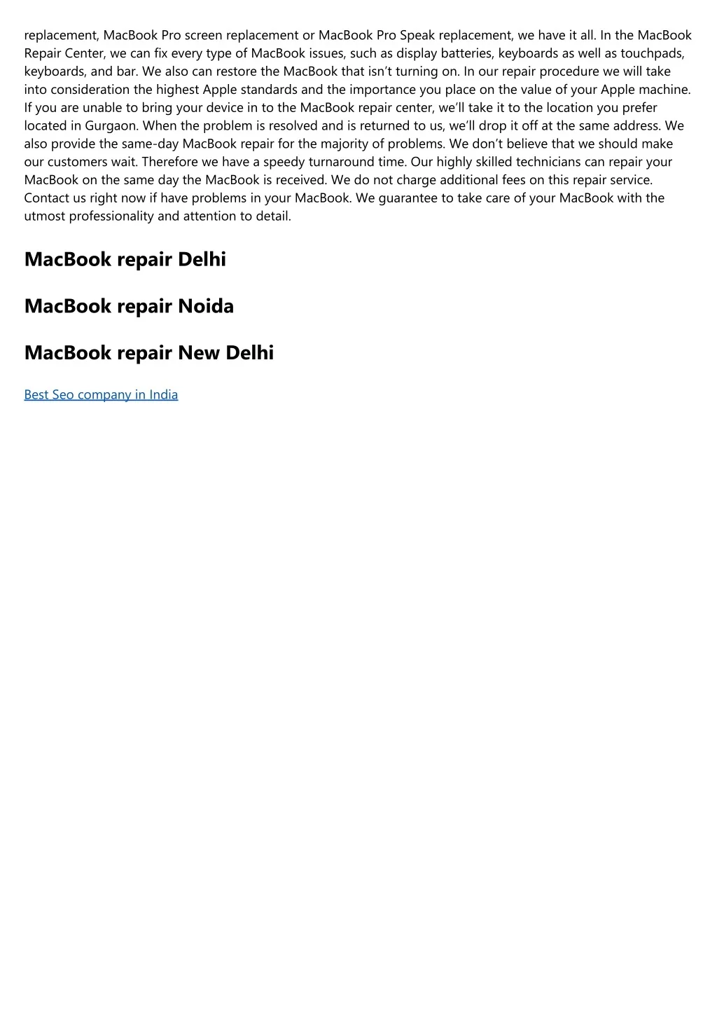 replacement, MacBook Pro screen replacement or MacBook Pro Speak replacement, we have it all. In the MacBook Repair Center, we can fix every type of MacBook issues, such as display batteries, keyboards as well as touchpads, keyboards, and bar. We also can restore the MacBook that isn’t turning on. In our repair procedure we will take into consideration the highest Apple standards and the importance you place on the value of your Apple machine. If you are unable to bring your device in to the MacBook repair center, we’ll take it to the location you prefer located in Gurgaon. When the problem is resolved and is returned to us, we’ll drop it off at the same address. We also provide the same-day MacBook repair for the majority of problems. We don’t believe that we should make our customers wait. Therefore we have a speedy turnaround time. Our highly skilled technicians can repair your MacBook on the same day the MacBook is received. We do not charge additional fees on this repair service. Contact us right now if have problems in your MacBook. We guarantee to take care of your MacBook with the utmost professionality and attention to detail. MacBook repair Delhi MacBook repair Noida MacBook repair New Delhi Best Seo company in India