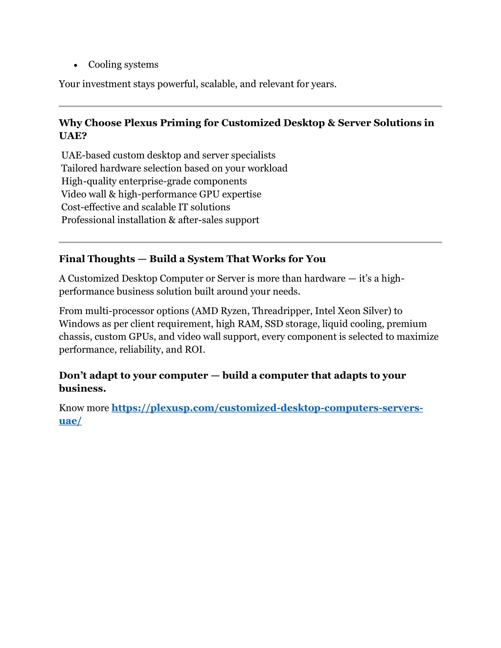 Cooling systems Your investment stays powerful, scalable, and relevant for years. Why Choose Plexus Priming for Customized Desktop & Server Solutions in UAE? UAE-based custom desktop and server specialists Tailored hardware selection based on your workload High-quality enterprise-grade components Video wall & high-performance GPU expertise Cost-effective and scalable IT solutions Professional installation & after-sales support Final Thoughts — Build a System That Works for You A Customized Desktop Computer or Server is more than hardware — it’s a high- performance business solution built around your needs. From multi-processor options (AMD Ryzen, Threadripper, Intel Xeon Silver) to Windows as per client requirement, high RAM, SSD storage, liquid cooling, premium chassis, custom GPUs, and video wall support, every component is selected to maximize performance, reliability, and ROI. Don’t adapt to your computer — build a computer that adapts to your business. Know more https://plexusp.com/customized-desktop-computers-servers- uae/