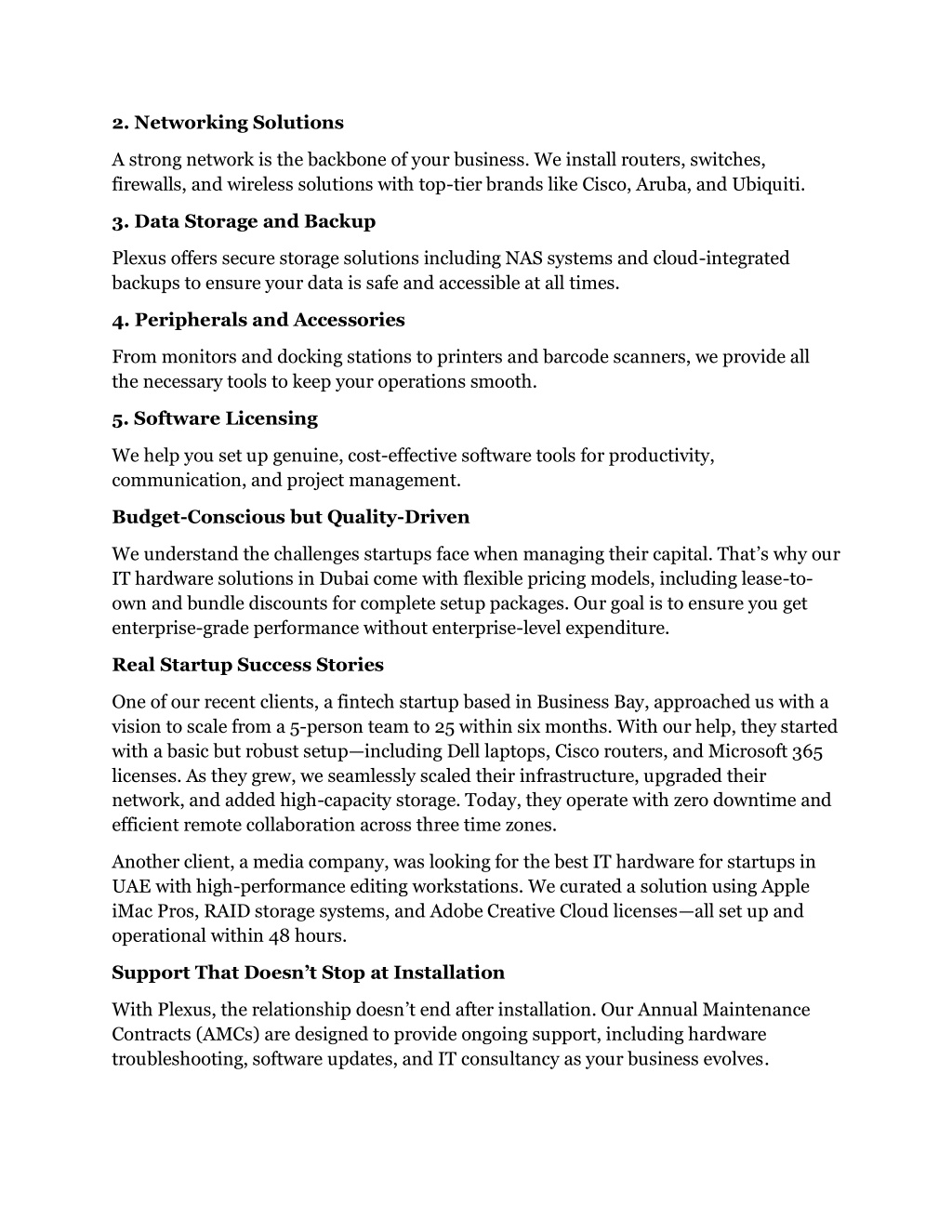 2. Networking Solutions A strong network is the backbone of your business. We install routers, switches, firewalls, and wireless solutions with top-tier brands like Cisco, Aruba, and Ubiquiti. 3. Data Storage and Backup Plexus offers secure storage solutions including NAS systems and cloud-integrated backups to ensure your data is safe and accessible at all times. 4. Peripherals and Accessories From monitors and docking stations to printers and barcode scanners, we provide all the necessary tools to keep your operations smooth. 5. Software Licensing We help you set up genuine, cost-effective software tools for productivity, communication, and project management. Budget-Conscious but Quality-Driven We understand the challenges startups face when managing their capital. That’s why our IT hardware solutions in Dubai come with flexible pricing models, including lease-to- own and bundle discounts for complete setup packages. Our goal is to ensure you get enterprise-grade performance without enterprise-level expenditure. Real Startup Success Stories One of our recent clients, a fintech startup based in Business Bay, approached us with a vision to scale from a 5-person team to 25 within six months. With our help, they started with a basic but robust setup—including Dell laptops, Cisco routers, and Microsoft 365 licenses. As they grew, we seamlessly scaled their infrastructure, upgraded their network, and added high-capacity storage. Today, they operate with zero downtime and efficient remote collaboration across three time zones. Another client, a media company, was looking for the best IT hardware for startups in UAE with high-performance editing workstations. We curated a solution using Apple iMac Pros, RAID storage systems, and Adobe Creative Cloud licenses—all set up and operational within 48 hours. Support That Doesn’t Stop at Installation With Plexus, the relationship doesn’t end after installation. Our Annual Maintenance Contracts (AMCs) are designed to provide ongoing support, including hardware troubleshooting, software updates, and IT consultancy as your business evolves.