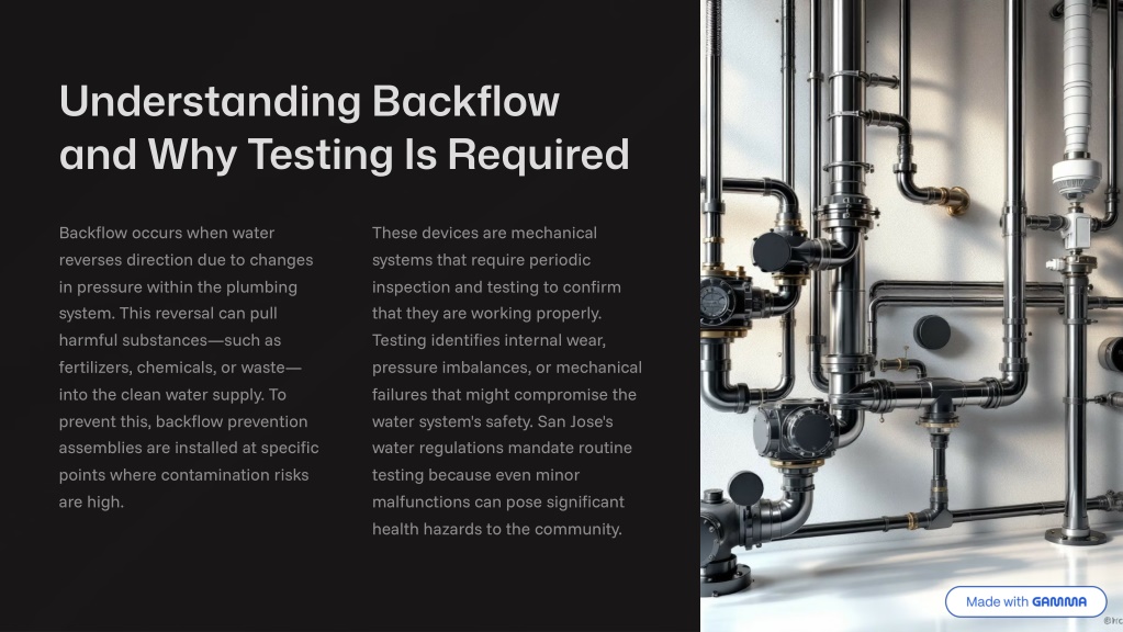 2. Understanding Backflow and Why Testing Is Required Backflow occurs when water reverses direction due to changes in pressure within the plumbing system. This reversal can pull harmful substances4such as fertilizers, chemicals, or waste4 into the clean water supply. To prevent this, backflow prevention assemblies are installed at specific points where contamination risks are high. These devices are mechanical systems that require periodic inspection and testing to confirm that they are working properly. Testing identifies internal wear, pressure imbalances, or mechanical failures that might compromise the water system's safety. San Jose's water regulations mandate routine testing because even minor malfunctions can pose significant health hazards to the community.