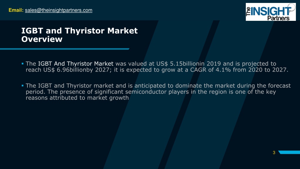 Email: sales@theinsightpartners.com IGBT and Thyristor Market Overview The IGBT And Thyristor Market was valued at US$ 5.15billionin 2019 and is projected to reach US$ 6.96billionby 2027; it is expected to grow at a CAGR of 4.1% from 2020 to 2027. The IGBT and Thyristor market and is anticipated to dominate the market during the forecast period. The presence of significant semiconductor players in the region is one of the key reasons attributed to market growth 3
