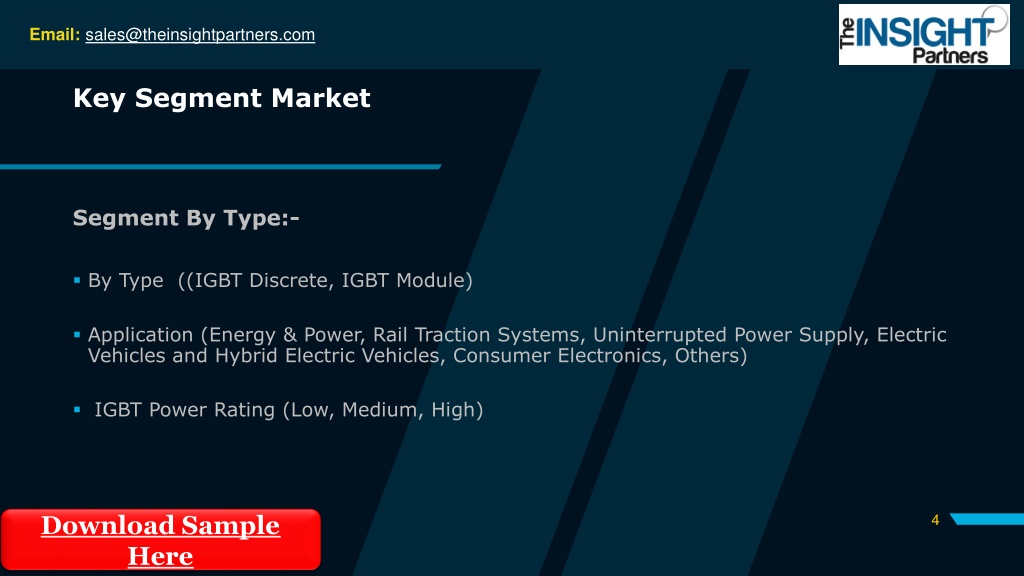 Email: sales@theinsightpartners.com Key Segment Market Segment By Type:- By Type ((IGBT Discrete, IGBT Module) Application (Energy & Power, Rail Traction Systems, Uninterrupted Power Supply, Electric Vehicles and Hybrid Electric Vehicles, Consumer Electronics, Others) IGBT Power Rating (Low, Medium, High) Download Sample Here 4