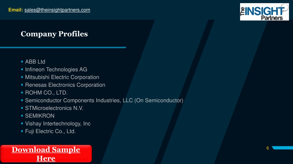Email: sales@theinsightpartners.com Company Profiles ABB Ltd Infineon Technologies AG Mitsubishi Electric Corporation Renesas Electronics Corporation ROHM CO., LTD. Semiconductor Components Industries, LLC (On Semiconductor) STMicroelectronics N.V. SEMIKRON Vishay Intertechnology, Inc Fuji Electric Co., Ltd. Download Sample Here 6