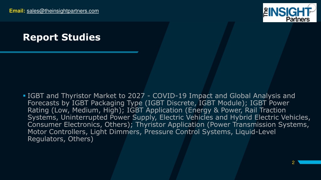 Email: sales@theinsightpartners.com Report Studies IGBT and Thyristor Market to 2027 - COVID-19 Impact and Global Analysis and Forecasts by IGBT Packaging Type (IGBT Discrete, IGBT Module); IGBT Power Rating (Low, Medium, High); IGBT Application (Energy & Power, Rail Traction Systems, Uninterrupted Power Supply, Electric Vehicles and Hybrid Electric Vehicles, Consumer Electronics, Others); Thyristor Application (Power Transmission Systems, Motor Controllers, Light Dimmers, Pressure Control Systems, Liquid-Level Regulators, Others) 2