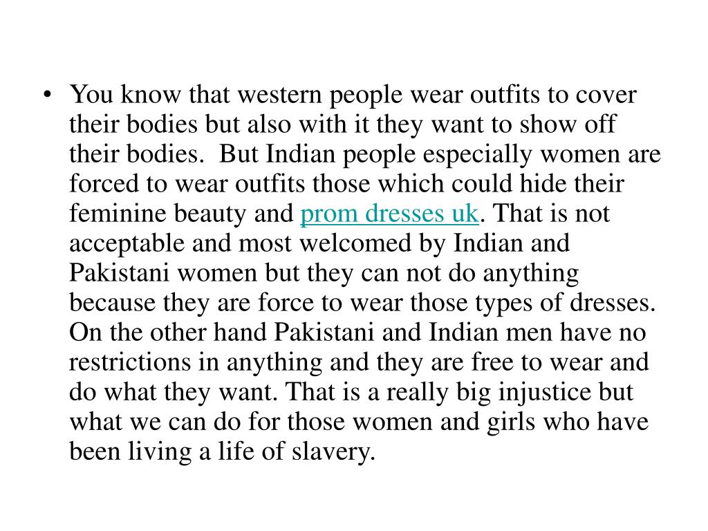 You know that western people wear outfits to cover their bodies but also with it they want to show off their bodies. But Indian people especially women are forced to wear outfits those which could hide their feminine beauty and prom dresses uk. That is not acceptable and most welcomed by Indian and Pakistani women but they can not do anything because they are force to wear those types of dresses. On the other hand Pakistani and Indian men have no restrictions in anything and they are free to wear and do what they want. That is a really big injustice but what we can do for those women and girls who have been living a life of slavery.