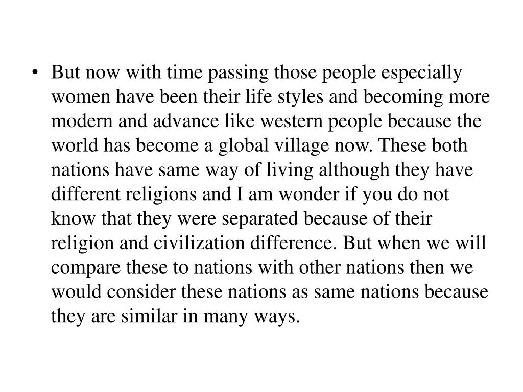 But now with time passing those people especially women have been their life styles and becoming more modern and advance like western people because the world has become a global village now. These both nations have same way of living although they have different religions and I am wonder if you do not know that they were separated because of their religion and civilization difference. But when we will compare these to nations with other nations then we would consider these nations as same nations because they are similar in many ways.