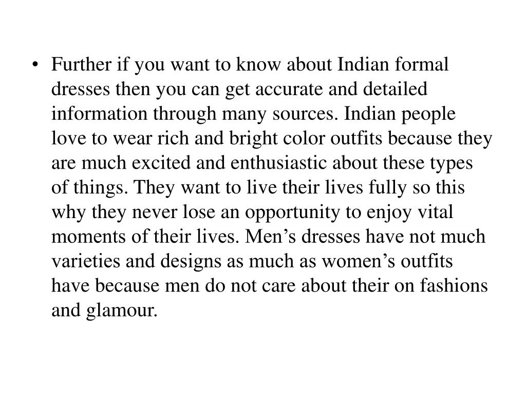 Further if you want to know about Indian formal dresses then you can get accurate and detailed information through many sources. Indian people love to wear rich and bright color outfits because they are much excited and enthusiastic about these types of things. They want to live their lives fully so this why they never lose an opportunity to enjoy vital moments of their lives. Men’s dresses have not much varieties and designs as much as women’s outfits have because men do not care about their on fashions and glamour.