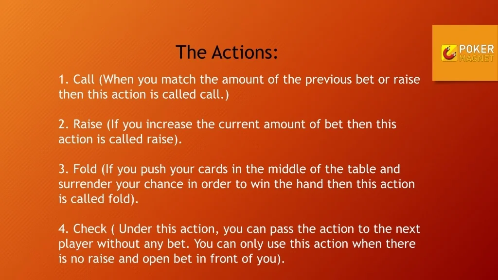 The Actions: 1. Call (When you match the amount of the previous bet or raise then this action is called call.) 2. Raise (If you increase the current amount of bet then this action is called raise). 3. Fold (If you push your cards in the middle of the table and surrender your chance in order to win the hand then this action is called fold). 4. Check ( Under this action, you can pass the action to the next player without any bet. You can only use this action when there is no raise and open bet in front of you).
