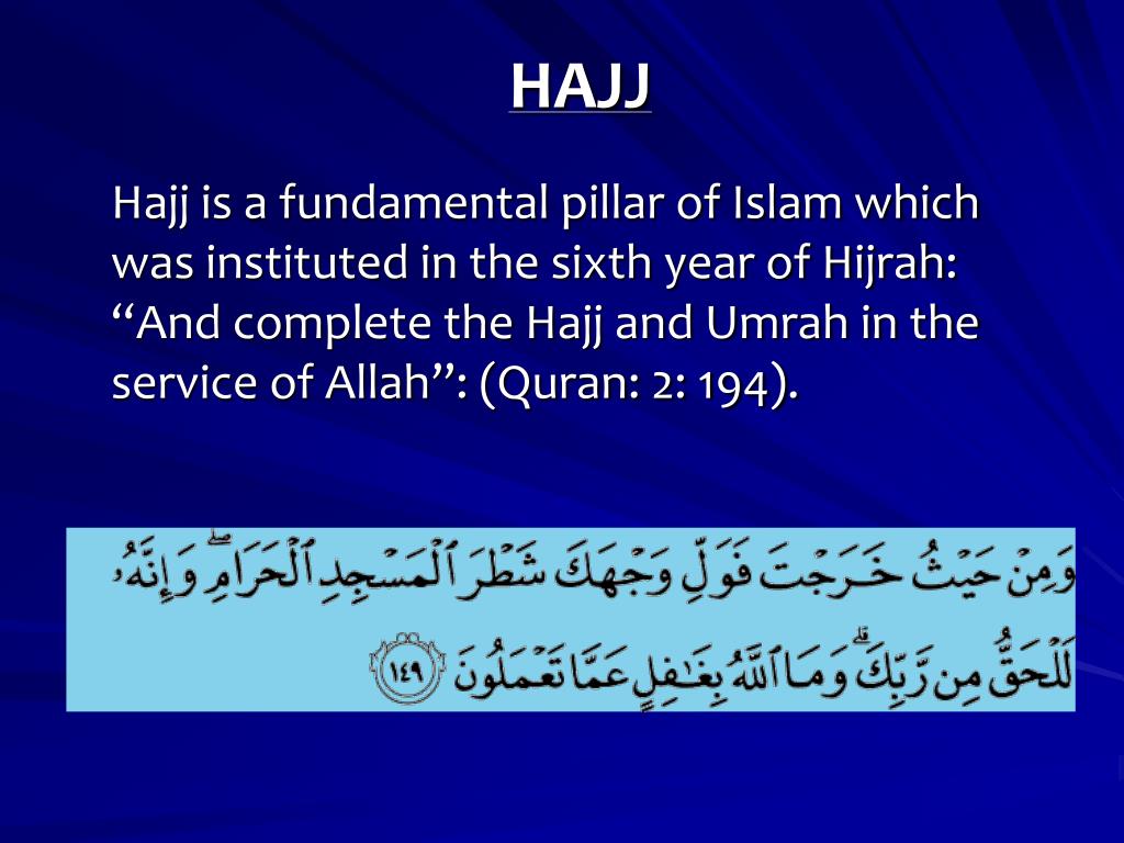FIQH ISLAMIC JURISPRUDENCE. HAJJ & SACRIFICE. HAJJ. Hajj is a fundamental pillar of Islam which was instituted in the sixth year of Hijrah: “And complete the Hajj and Umrah in the service of Allah”: (Quran: 2: 194). HAJJ.