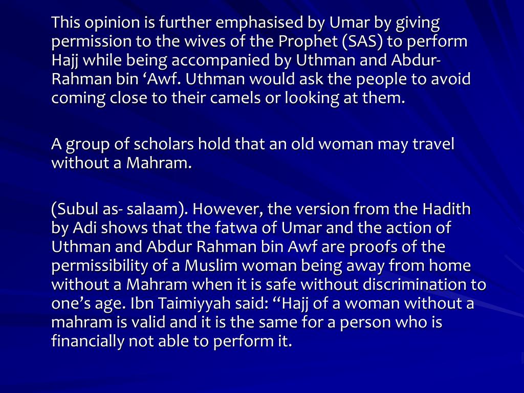 This opinion is further emphasised by Umar by giving permission to the wives of the Prophet (SAS) to perform Hajj while being accompanied by Uthman and Abdur-Rahman bin ‘Awf. Uthman would ask the people to avoid coming close to their camels or looking at them. A group of scholars hold that an old woman may travel without a Mahram. (Subul as- salaam). However, the version from the Hadith by Adi shows that the fatwa of Umar and the action of Uthman and Abdur Rahman bin Awf are proofs of the permissibility of a Muslim woman being away from home without a Mahram when it is safe without discrimination to one’s age. Ibn Taimiyyah said: “Hajj of a woman without a mahram is valid and it is the same for a person who is financially not able to perform it.