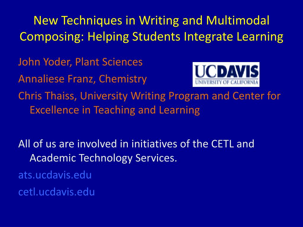 New Techniques in Writing and Multimodal Composing: Helping Students Integrate Learning John Yoder, Plant Sciences Annaliese Franz, Chemistry Chris Thaiss, University Writing Program and Center for Excellence in Teaching and Learning All of us are involved in initiatives of the CETL and Academic Technology Services. ats.ucdavis.edu cetl.ucdavis.edu