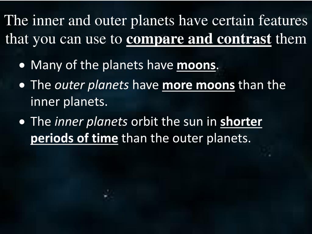 The inner and outer planets have certain features that you can use to compare and contrast them • Many of the planets have moons. • The outer planets have more moons than the inner planets. • The inner planets orbit the sun in shorter periods of time than the outer planets.