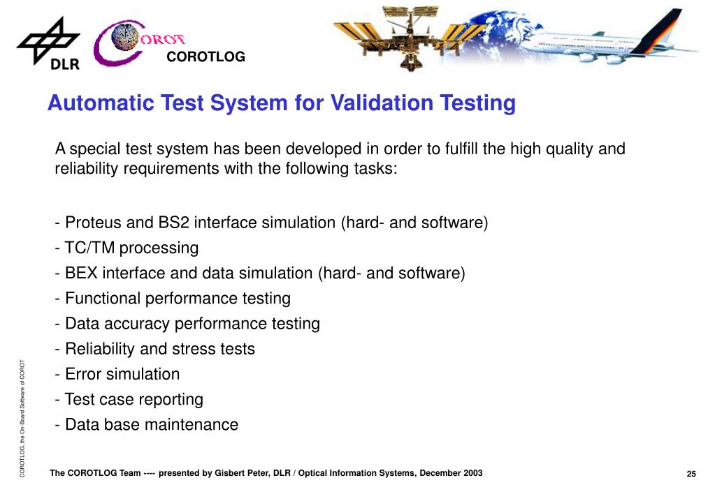 Automatic Test System for Validation Testing • A special test system has been developed in order to fulfill the high quality and reliability requirements with the following tasks: • Proteus and BS2 interface simulation (hard- and software) • TC/TM processing • BEX interface and data simulation (hard- and software) • Functional performance testing • Data accuracy performance testing • Reliability and stress tests • Error simulation • Test case reporting • Data base maintenance