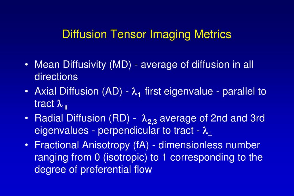 Diffusion Tensor Imaging Metrics • Mean Diffusivity (MD) - average of diffusion in all directions • Axial Diffusion (AD) - 1first eigenvalue - parallel to tract • Radial Diffusion (RD) - 2,3 average of 2nd and 3rd eigenvalues - perpendicular to tract - • Fractional Anisotropy (fA) - dimensionless number ranging from 0 (isotropic) to 1 corresponding to the degree of preferential flow