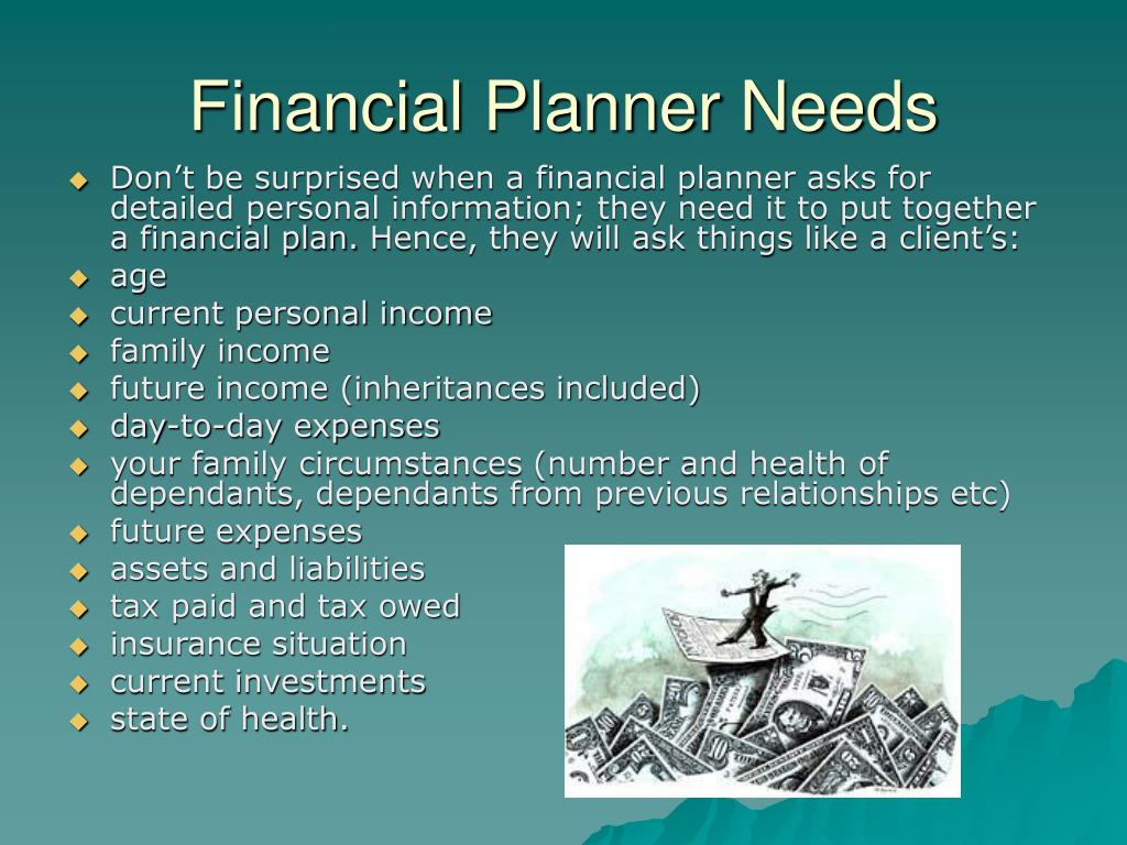 Financial Planner Needs • Don’t be surprised when a financial planner asks for detailed personal information; they need it to put together a financial plan. Hence, they will ask things like a client’s: • age • current personal income • family income • future income (inheritances included) • day-to-day expenses • your family circumstances (number and health of dependants, dependants from previous relationships etc) • future expenses • assets and liabilities • tax paid and tax owed • insurance situation • current investments • state of health.
