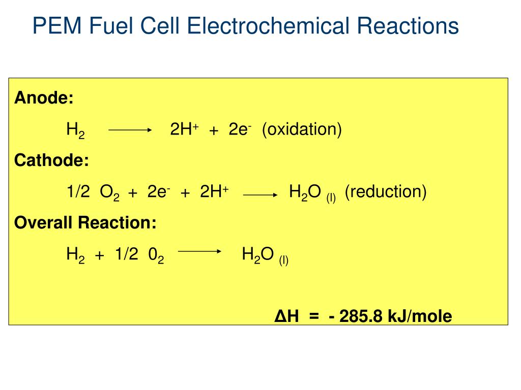 PEM Fuel Cell Electrochemical Reactions Anode: H2 2H+ + 2e- (oxidation) Cathode: 1/2 O2 + 2e- + 2H+ H2O (l) (reduction) Overall Reaction: H2 + 1/2 02 H2O (l) ΔH = - 285.8 kJ/mole