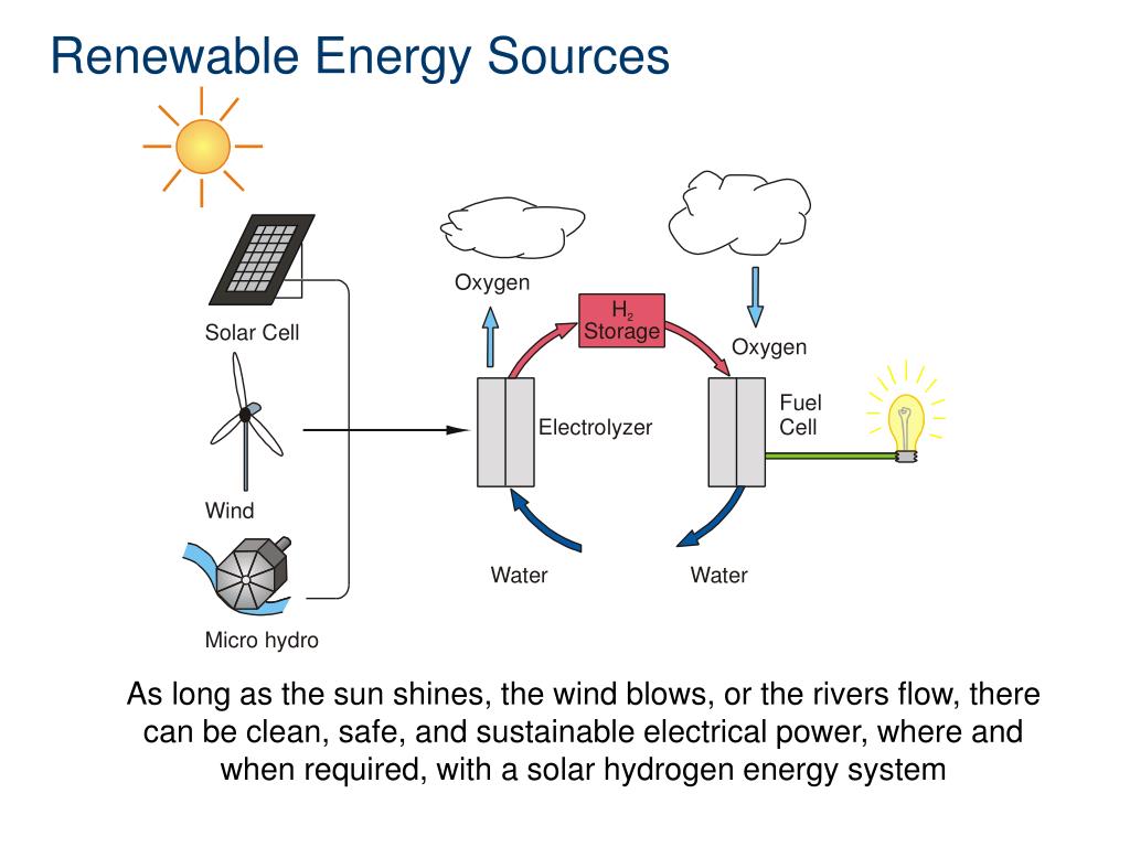 Renewable Energy Sources As long as the sun shines, the wind blows, or the rivers flow, there can be clean, safe, and sustainable electrical power, where and when required, with a solar hydrogen energy system