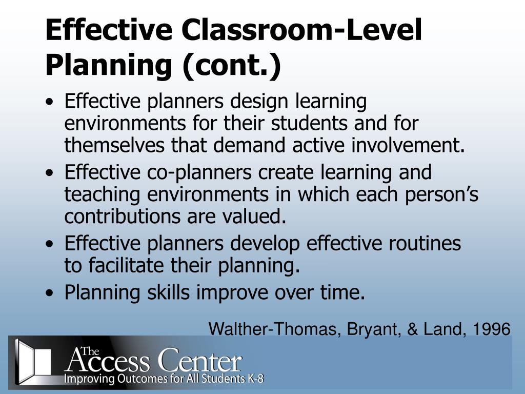 Effective Classroom-Level Planning (cont.) • Effective planners design learning environments for their students and for themselves that demand active involvement. • Effective co-planners create learning and teaching environments in which each person’s contributions are valued. • Effective planners develop effective routines to facilitate their planning. • Planning skills improve over time. Walther-Thomas, Bryant, & Land, 1996