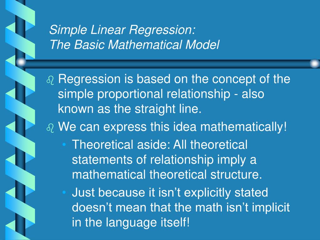 Simple Linear Regression: The Basic Mathematical Model • Regression is based on the concept of the simple proportional relationship - also known as the straight line. • We can express this idea mathematically! • Theoretical aside: All theoretical statements of relationship imply a mathematical theoretical structure. • Just because it isn’t explicitly stated doesn’t mean that the math isn’t implicit in the language itself!