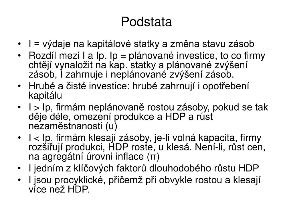 Podstata • I = výdaje na kapitálové statky a změna stavu zásob • Rozdíl mezi I a Ip. Ip = plánované investice, to co firmy chtějí vynaložit na kap. statky a plánované zvýšení zásob, I zahrnuje i neplánované zvýšení zásob. • Hrubé a čisté investice: hrubé zahrnují i opotřebení kapitálu • I > Ip, firmám neplánovaně rostou zásoby, pokud se tak děje déle, omezení produkce a HDP a růst nezaměstnanosti (u) • I < Ip, firmám klesají zásoby, je-li volná kapacita, firmy rozšiřují produkci, HDP roste, u klesá. Není-li, růst cen, na agregátní úrovni inflace (π) • I jedním z klíčových faktorů dlouhodobého růstu HDP • I jsou procyklické, přičemž při obvykle rostou a klesají více než HDP.