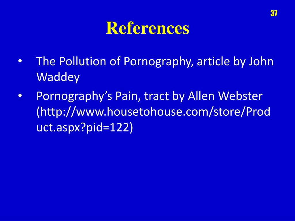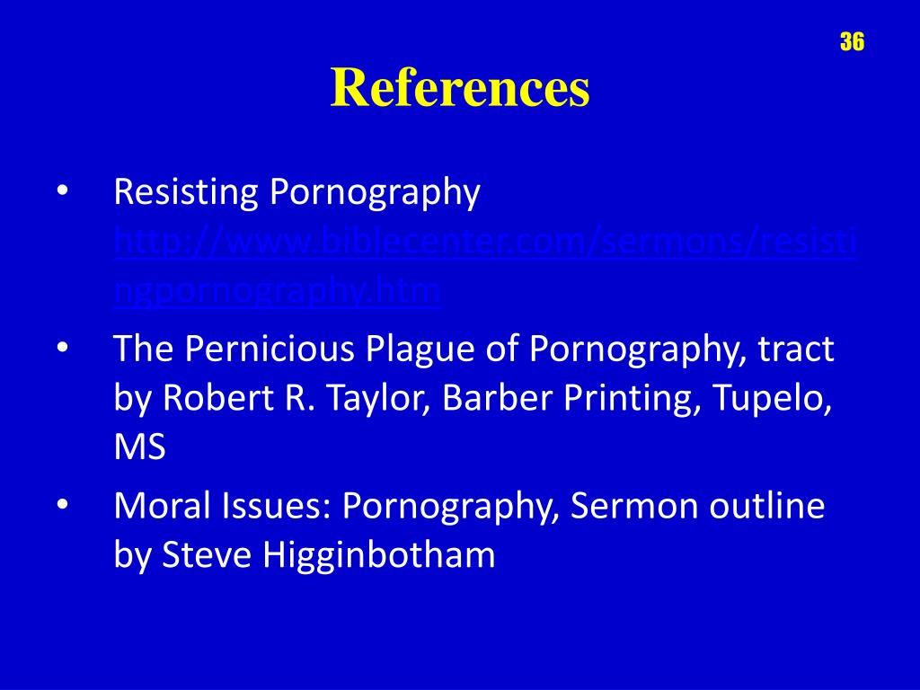 Resisting Pornography http://www.biblecenter.com/sermons/resistingpornography.htm The Pernicious Plague of Pornography, tract by Robert R. Taylor, Barber Printing, Tupelo, MS Moral Issues: Pornography, Sermon outline by Steve Higginbotham References