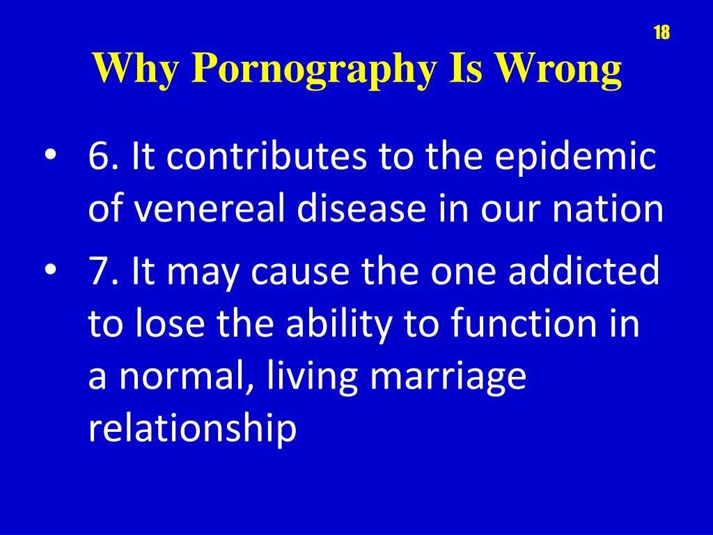 6. It contributes to the epidemic of venereal disease in our nation 7. It may cause the one addicted to lose the ability to function in a normal, living marriage relationship Why Pornography Is Wrong